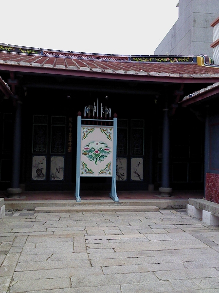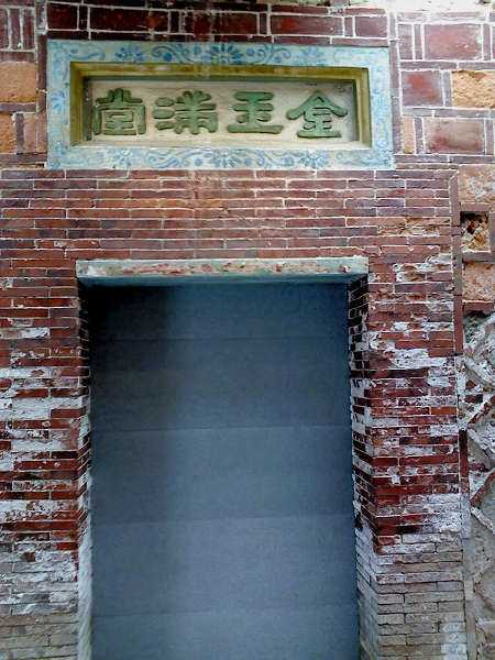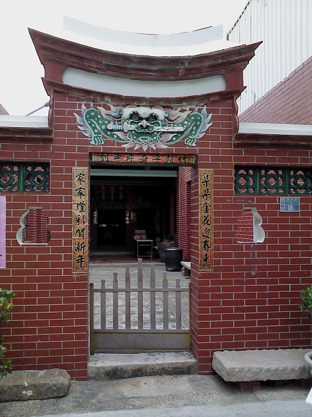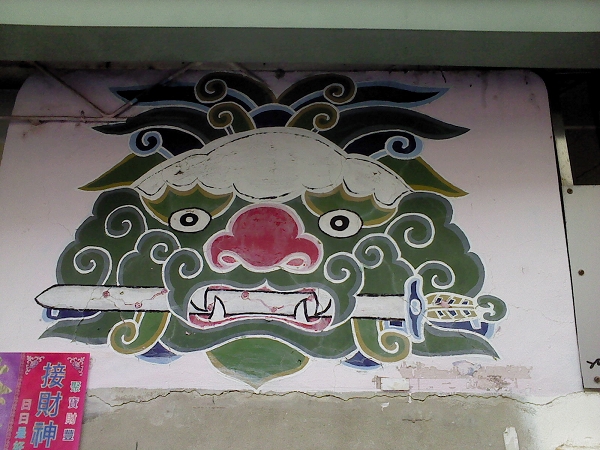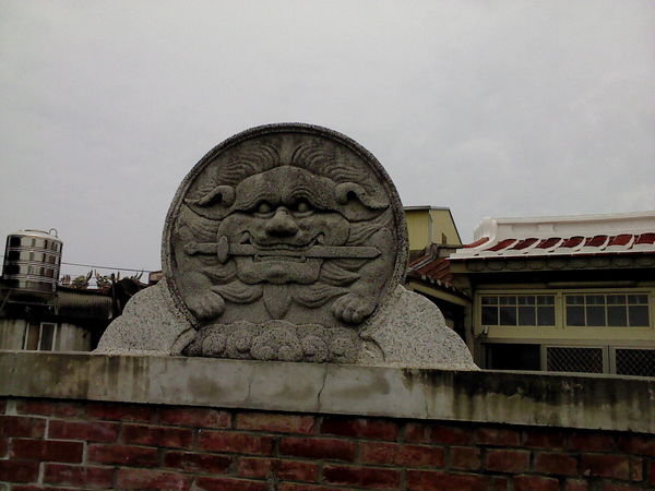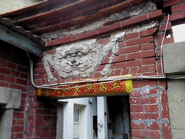 路衝的牆上有劍獅守護,門則蓋在旁邊